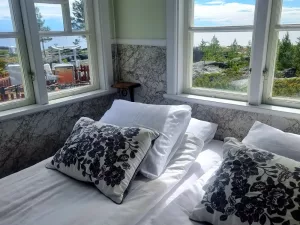 Lotsstugan kan rymma upp till sex gäster och erbjuder tre rum med fantastisk havsutsikt samt tre badrum med dusch.